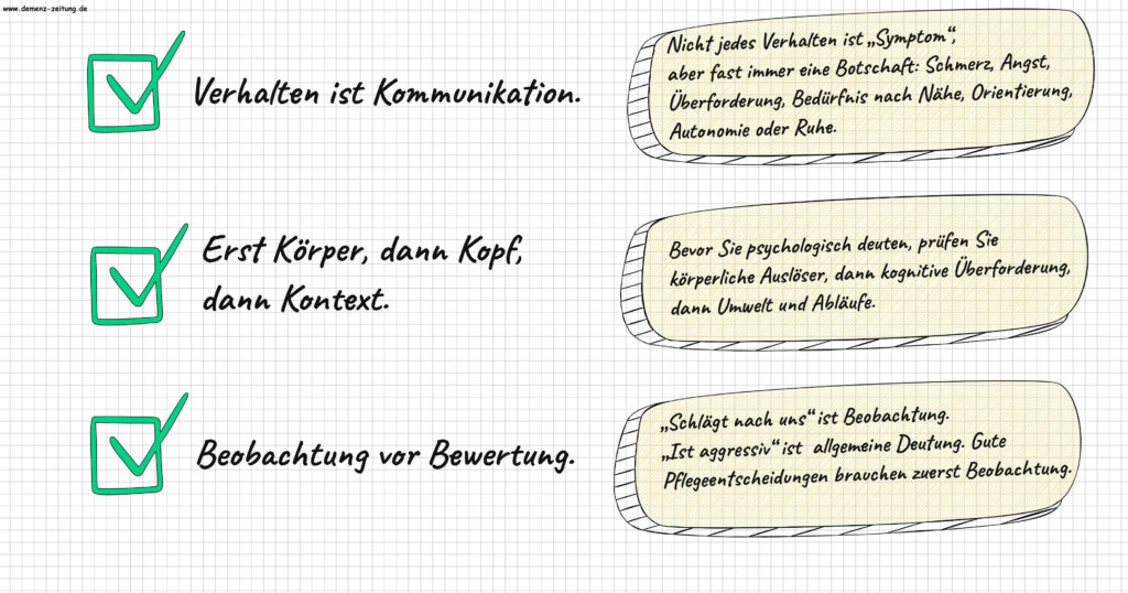 Herausforderndes Verhalten wirkt im Moment oft wie ein persönlicher Angriff oder wie „reine Unkooperativität“. Im Alltag hilft es, den emotionalen Impuls kurz zu parken und in einen strukturierten Modus zu wechseln: erst beobachten, dann prüfen, dann handeln – und das Ganze so dokumentieren, dass es in Übergabe, Visite und Verlegungsbericht sofort nutzbar ist.